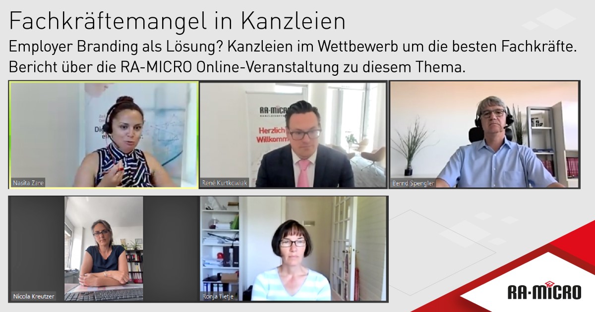 Im online Veranstaltungsformat einer Fishbowl-Diskussion lud RA-MICRO zum Austausch über das wichtige Thema des Fachkräftemangels in Kanzleien. Die beiden Moderatoren Politikwissenschaftlerin Nasita Zare, Leiterin der RA-MICRO Landesrepräsentanz Nord (Kiel) und Wirtschaftspsychologe, Betriebswirt und Rechtsfachwirt René Kurtkowiak, Leiter der Landesrepräsentanz West (Düsseldorf), führten durch die einstündige online Veranstaltung, an der Interessierte kostenfrei teilnehmen konnten.