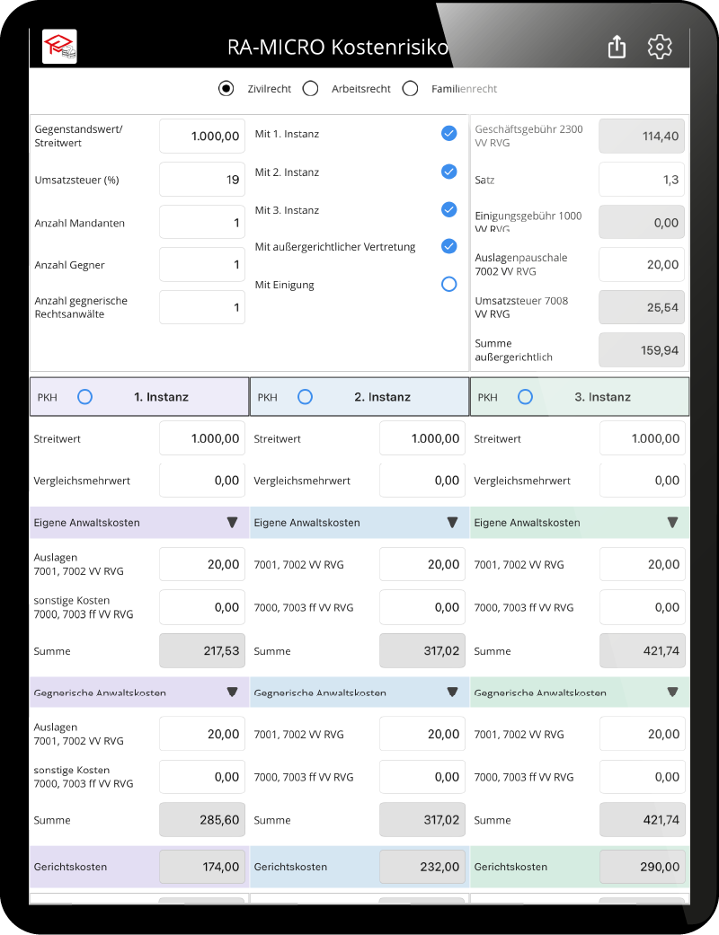 Mit der kostenlosen RA-MICRO Kostenrisiko App können Sie einfach und mit wenigen Eingaben zu erwartende Anwalts- und Verfahrenskostenrisiken über alle Instanzen bestimmen. Die integrierte Quotentabelle ist der Schlüssel zur Perfektionierung Ihrer Vergleichsstrategie.