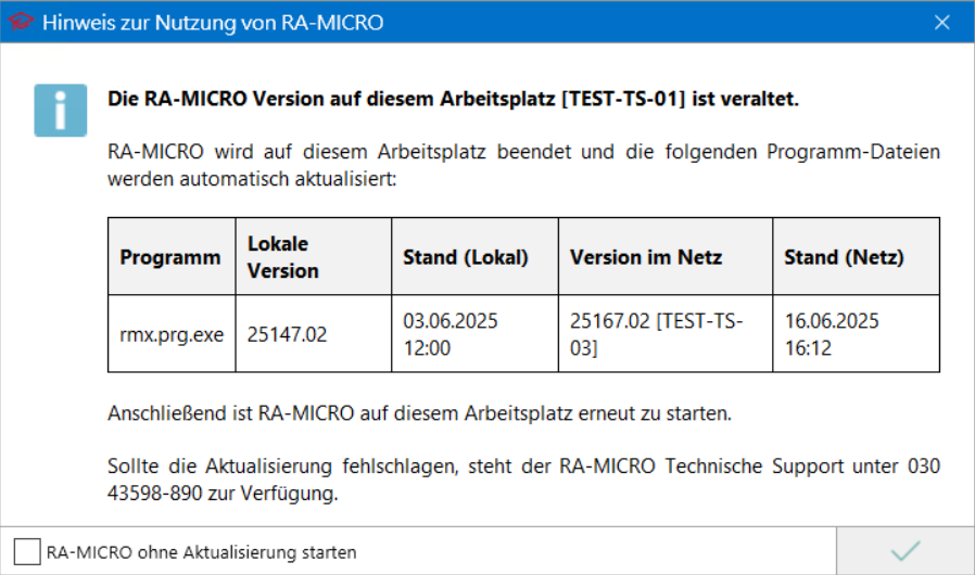 Beim Start von RA-MICRO prüft das System, ob alle Arbeitsplätze mit der aktuellsten verfügbaren Programmversion im Netzwerk arbeiten. Dies verhindert Kompatibilitätsprobleme, Sicherheitslücken und unterschiedliche Funktionsstände zwischen einzelnen Arbeitsplätzen.