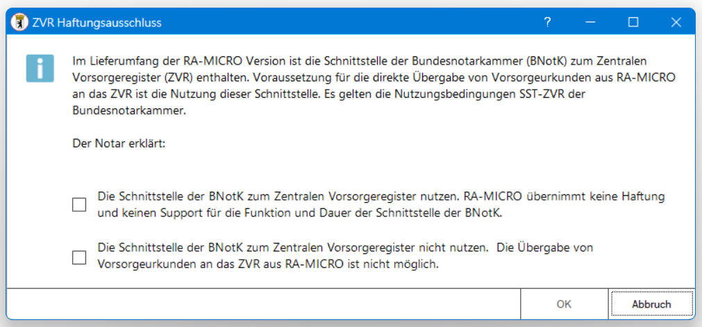 Die neue Schnittstelle für die Übergabe von Vorsorgeurkunden an das Zentrale Vorsorgeregister (ZVR) der Bundesnotarkammer wurde eingebunden. Der bisherige Datei-Upload wird von der Bundesnotarkammer zum 30.11.2024 eingestellt.